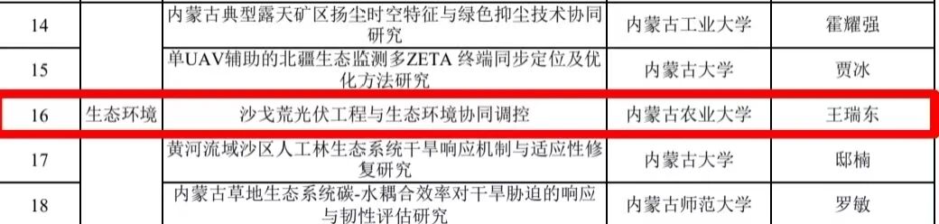 近日,内蒙古自治区教育厅公布了2025年度内蒙古自治区高校青年教师科研创新能力支持项目的评审结果,学院教师王瑞东获批生态环境类项目《沙戈荒光伏工程与生态工程协同调控》!