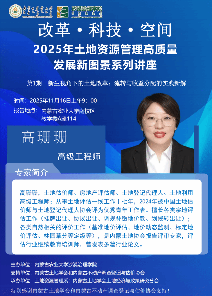 为帮助新生建立对土地改革领域的实践认知,深入理解集体土地流转与收益分配的实际运作逻辑,11月16日上午9:00,内蒙古农业大学沙漠治理学院在南校区教学楼A座114室,启动“改革·科技·空间:2025年土地资源管理高质量发展新图景系列讲座”首期活动,主题为“新生视角下的土地改革:流转与收益分配的实践新解”。本次讲座邀请高级工程师高珊珊担任主讲人,内蒙古不动产调查登记与估价协会专家库专家及学院25级土地资源管理专业全体学生参加。