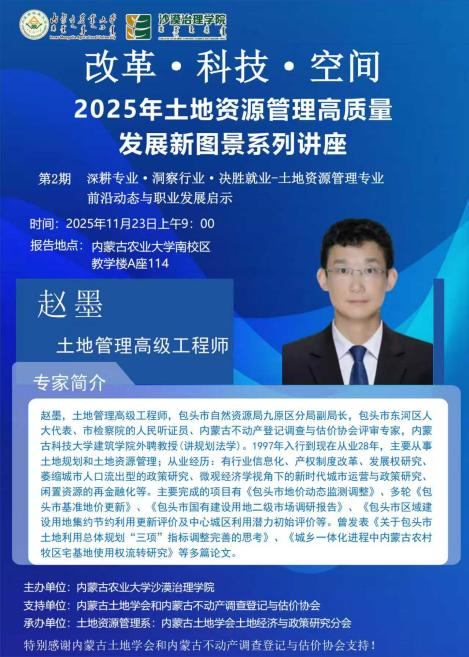 为帮助学生深化专业认知、贯通学科前沿与行业实践,11月23日上午,学院于南教114室开展第二期“改革·科技·空间”系列讲座。特邀土地管理高级工程师、包头市自然资源局九原区分局副局长赵墨主讲,内蒙古土地学会、内蒙古不动产调查登记与估价协会成员以及专业教师代表、2025级土地资源管理专业新生参加。
