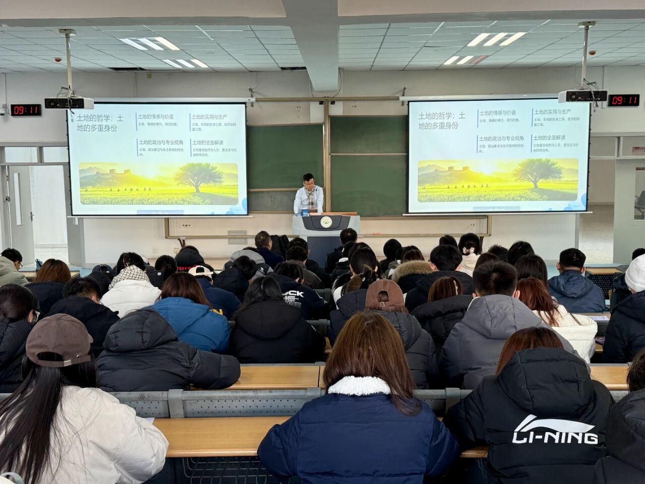 讲座从专业前沿动态、行业实践逻辑与职业发展启示三个维度展开。赵墨结合《包头市区域建设用地集约节约利用更新评价》《基准地价更新》等实际项目,深入剖析空间信息技术与土地管理深度融合的趋势,解读城乡一体化背景下的宅基地流转等政策导向。还从“微观经济学视角下的城市运营”“人口流出型城市土地政策”等具体课题出发,生动阐释土地管理在政府决策与市场运作中的实际角色。